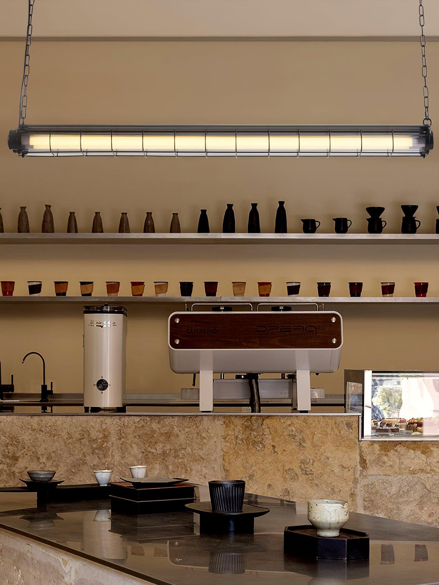 A 48” long row of symmetrical channel-set diffusers, each handcrafted artisan from clear cast glass, evokes the look of jewelry in this glittering linear chandelier. Sleek and sparkling, this clean-lined design elevates kitchens, bars and other functional entertaining spaces without blocking views.