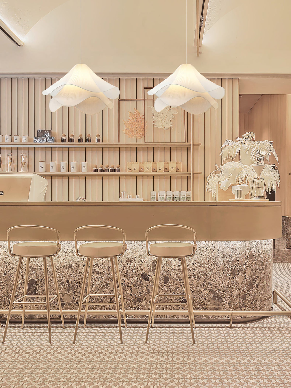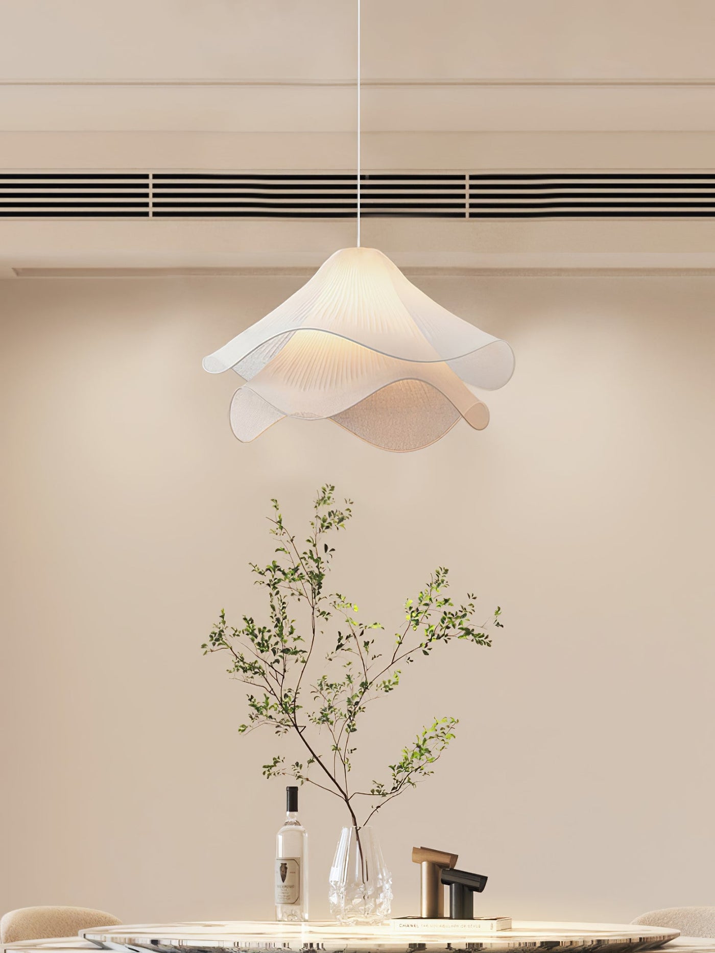 The Ethereal Bloom Pendant Light is an elegant and graceful suspension piece featuring multiple layers of light white fabric with delicate pleats, creating an energetic appearance reminiscent of blooming flowers or swirling skirts. Soft light diffuses through the layered shades, accentuating the gleaming brass hardware of the pendant. This delicate look will float beautifully above dining tables, living rooms, or bedrooms.