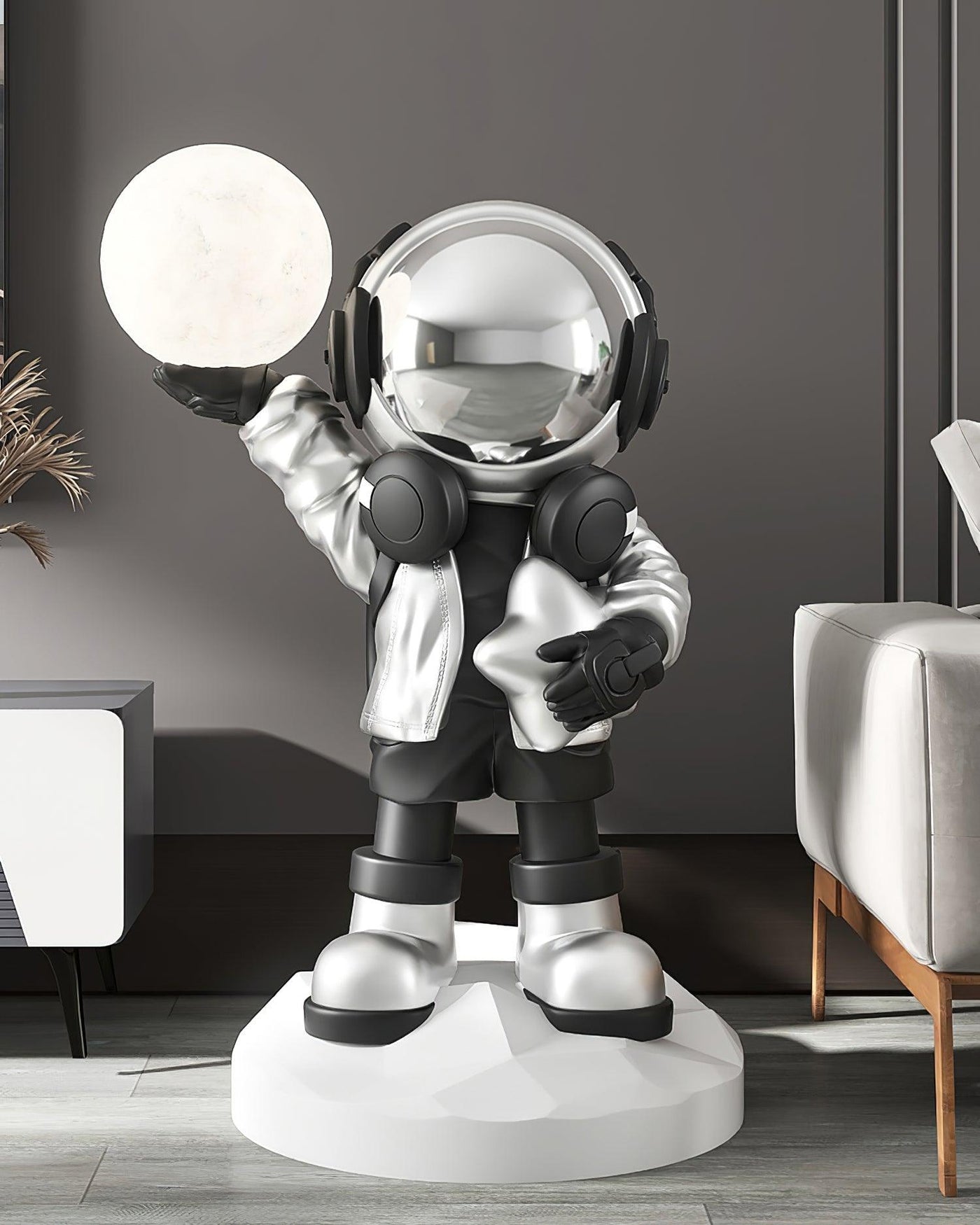 Verschönern Sie Ihre Wohndekoration und bringen Sie mit der integrierten Akku-Stehleuchte ein Gefühl von Staunen und Fernweh in Ihren Raum. Die aus Harz gefertigte Lampe erinnert an Missionen und Weltraumforschung – perfekt für Weltraumbegeisterte. Der eingebaute Akku ermöglicht eine flexible, kabellose Platzierung – ideal für Schlafzimmer, Spielzimmer oder Homeoffice – und verbindet praktische Beleuchtung mit einem einzigartigen, weltraumbezogenen Dekor, das auffällt.