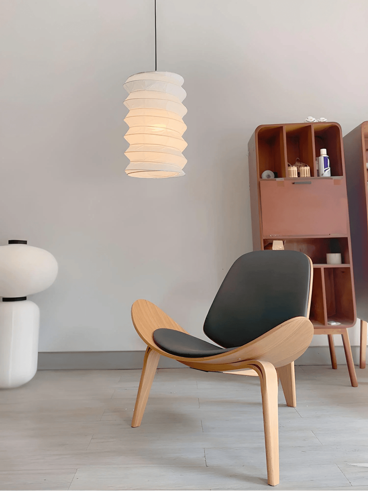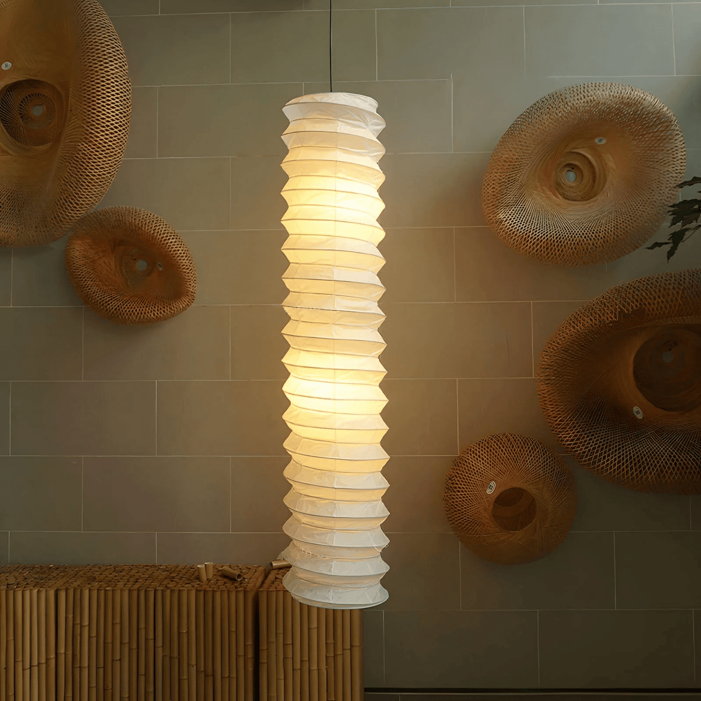 Die Pendelleuchte besticht durch zartes Washi-Papier in skulpturaler, runder Form. Das japanisch inspirierte Design verleiht minimalistischen Interieurs Eleganz. Sanftes Licht schafft eine ruhige und einladende Atmosphäre. Die handwerkliche Konstruktion verleiht Räumen raffinierte Details. Ihr dezenter Glanz verbindet Kunstfertigkeit und Funktionalität.