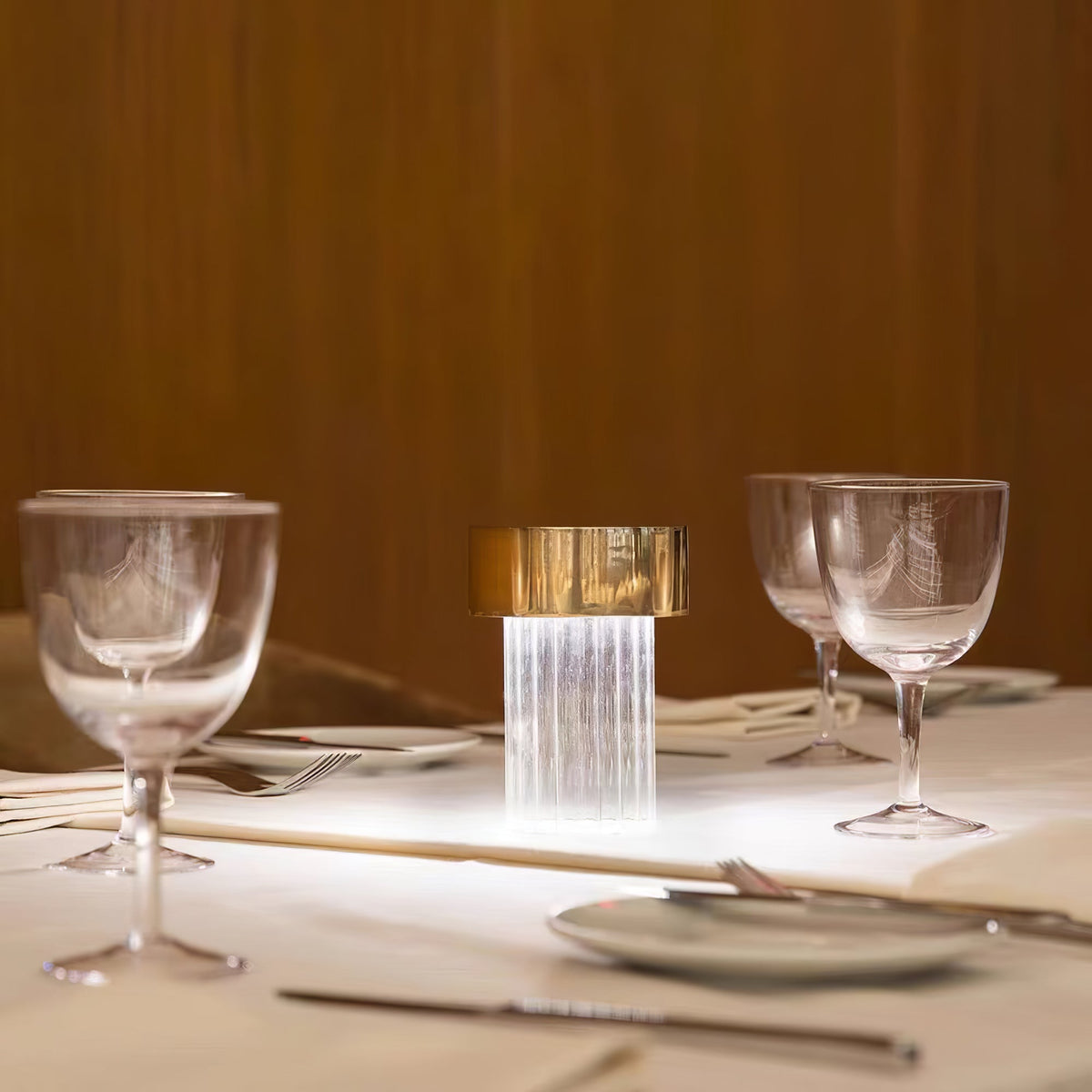 Die tragbare Tischleuchte erhellt Wohn- und Schlafzimmer elegant. Ihr Glassäulenfuß verleiht Schreibtischen und Beistelltischen einen klassischen Touch. Die wiederaufladbare Tischleuchte sorgt überall für angenehme Beleuchtung. Das schlanke Design ergänzt moderne Interieurs.