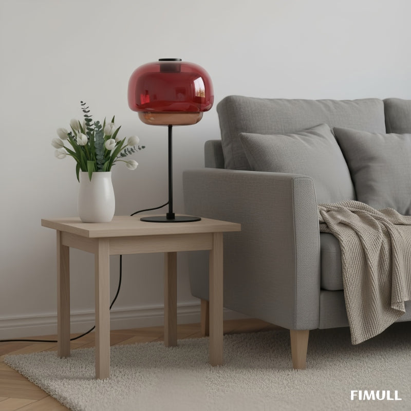 The Clinco table lamp features a sculptural double-layered glass shade. Its hand-blown combination of translucent and opaque colored glass creates a warm, diffused glow, adding a retro-modern accent to any living space.